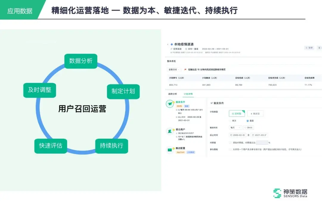神策智能运营,可提升整个运营编辑和运营团队的效率。比如要做本地疫情速递,就可以在产品界面上去配置,定时推送,减少不必要的人工劳动。
