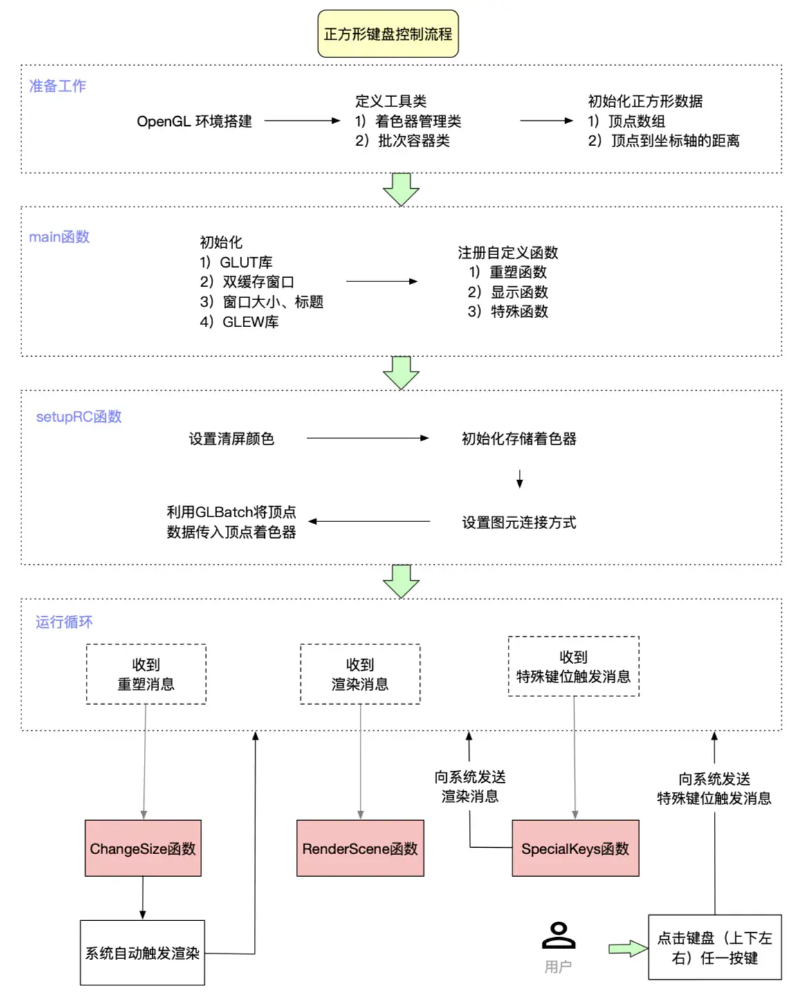 GLUT 内部运行一个本地消息循环,拦截适当的消息。然后调用我们不同时间注册的回调函数。我们一共注册2个回调函数: