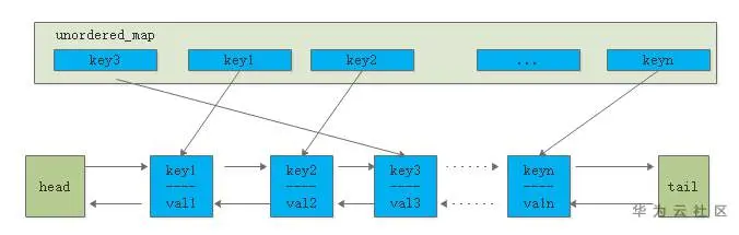 一般采用unordered_map+list来实现,访问数据时,直接从unordered_map通过key在O(1)时间内获取到所需数据。有新数据时,插入到链表的头部;当缓存命中时,也将数据移动到链表头部;当缓存满时将链表尾部的数据丢弃。