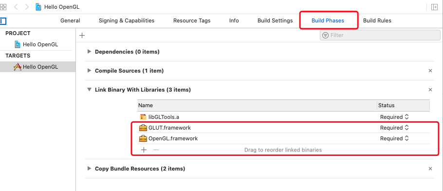 2. 增加OpenGl.framework GLUT.framework两个系统库