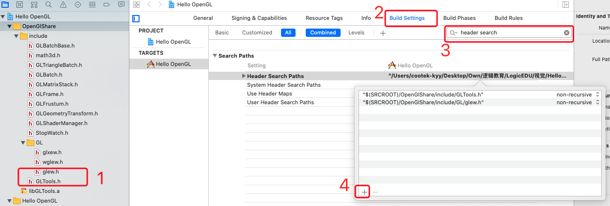 - BuildSettings -> 输入Header Search Path, 拖入CLTools.h 和 glew.h的路径