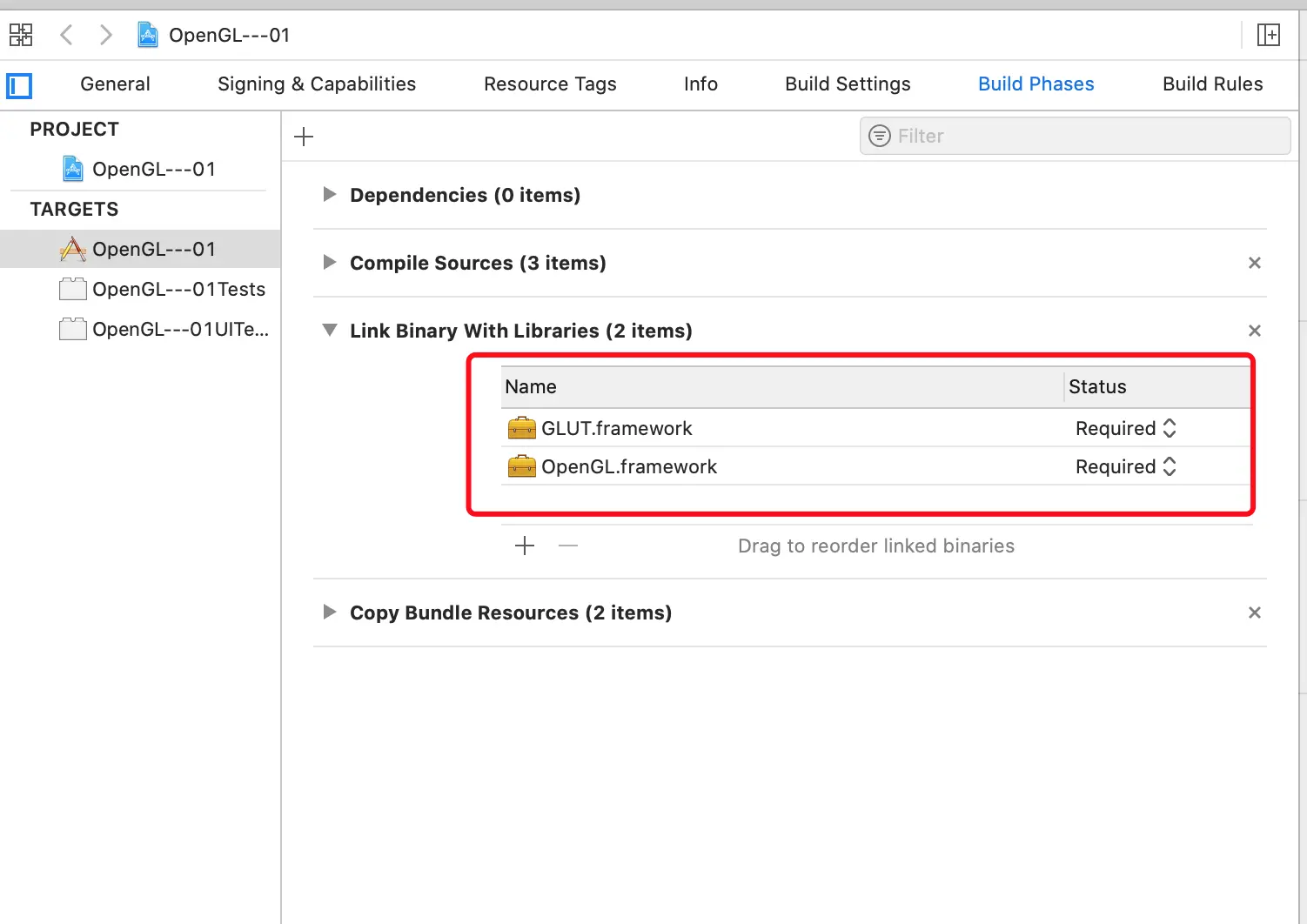 添加GpenGL.framework 和GLUT.framework两个系统库