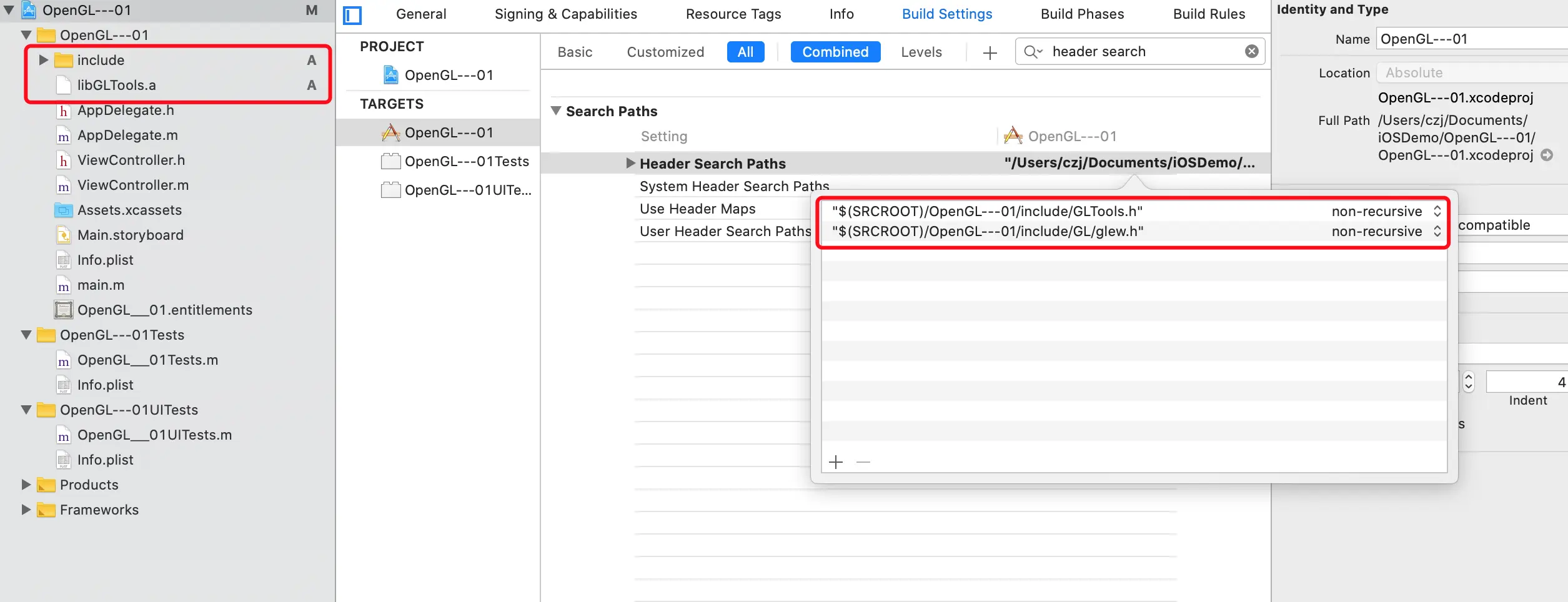 在工程中拖入include文件夹,和libGLTools.a文件 在Bulid Settings的Header Search path中拖入GLTool.h,glew.h