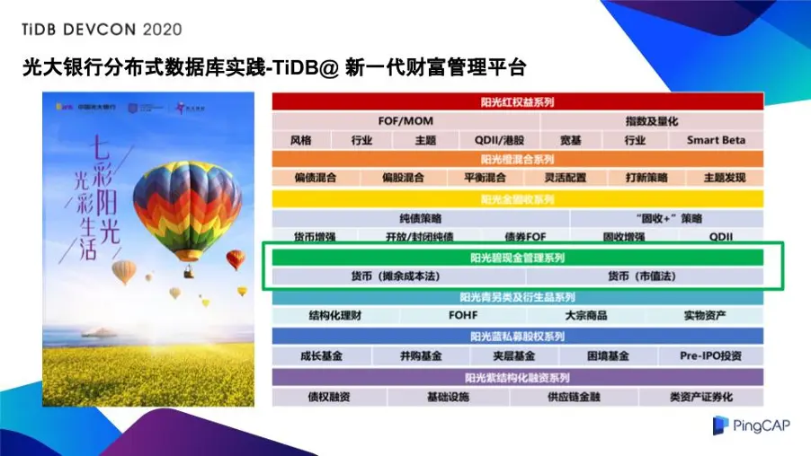 在这里安利一下光大的理财,光大理财的品牌叫做七彩阳光理财,大家看到这个图里七彩阳光是七种不同的理财风格,既有权益理财,也有混合型理财,我们把 TiDB 用到了现金理财,就是绿色的这一部分,叫阳光碧现金理财,在这里我们是在受众最广的渠道中去应用我们真正需要它的技术。