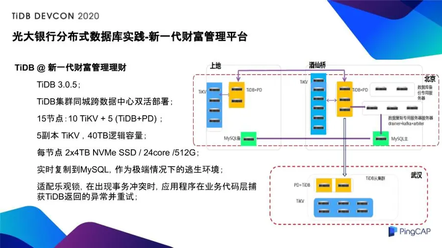 具体到了 TiDB,我们这次实施的是 TiDB 3.0.5 产品,我们在北京有两个中心,同城跨中心部署,15 节点,5 副本的 TiKV,设计的是 40TB 的逻辑容量,每个节点是专门为这个项目采购的机架式服务器,有两个 4TB 的 SSD,24 核,512G 的内存。因为这是个重要产品,应该说“切入即决战”,所以为了保障新一代数据库的平稳运行,我们可以开最好的车,但是一定要系好安全带,这个安全带就是我们在实施的过程中,除了 TiDB 本身,我们还把 TiDB 的数据实时复制到了 MySQL,用一个异构的数据库来保证一旦出现极端情况,能有一个逃生环境,去挽救我们的数据,挽救我们整个的应用。大家都知道 TiDB 之前版本有个乐观锁特性(TiDB 4.0 版本 正式推出了悲观锁功能,和 RC 隔离级别,使用 TiDB 4.0 让应用适配更容易),这个是怎么适配的呢?后面 TiDB 有他自己的一个方案,但是我们这个版本还没有这个特性,我们在整个过程中做了大量的适配的,在出现业务冲突的时候,应用程序和业务代码能捕获异常、重试机制,我们和 TiDB 的专家也做了很多合作,我们的开发人员也做了很多修改,为什么这么做呢?还是回到初心,我们希望用一个产品解决这个问题,但我们不完全依赖某个产品解决我们的问题,我们根据他的特色选定了他,然后我们要适配他,这个事就像爱情一样,你爱他就要爱他的全部。