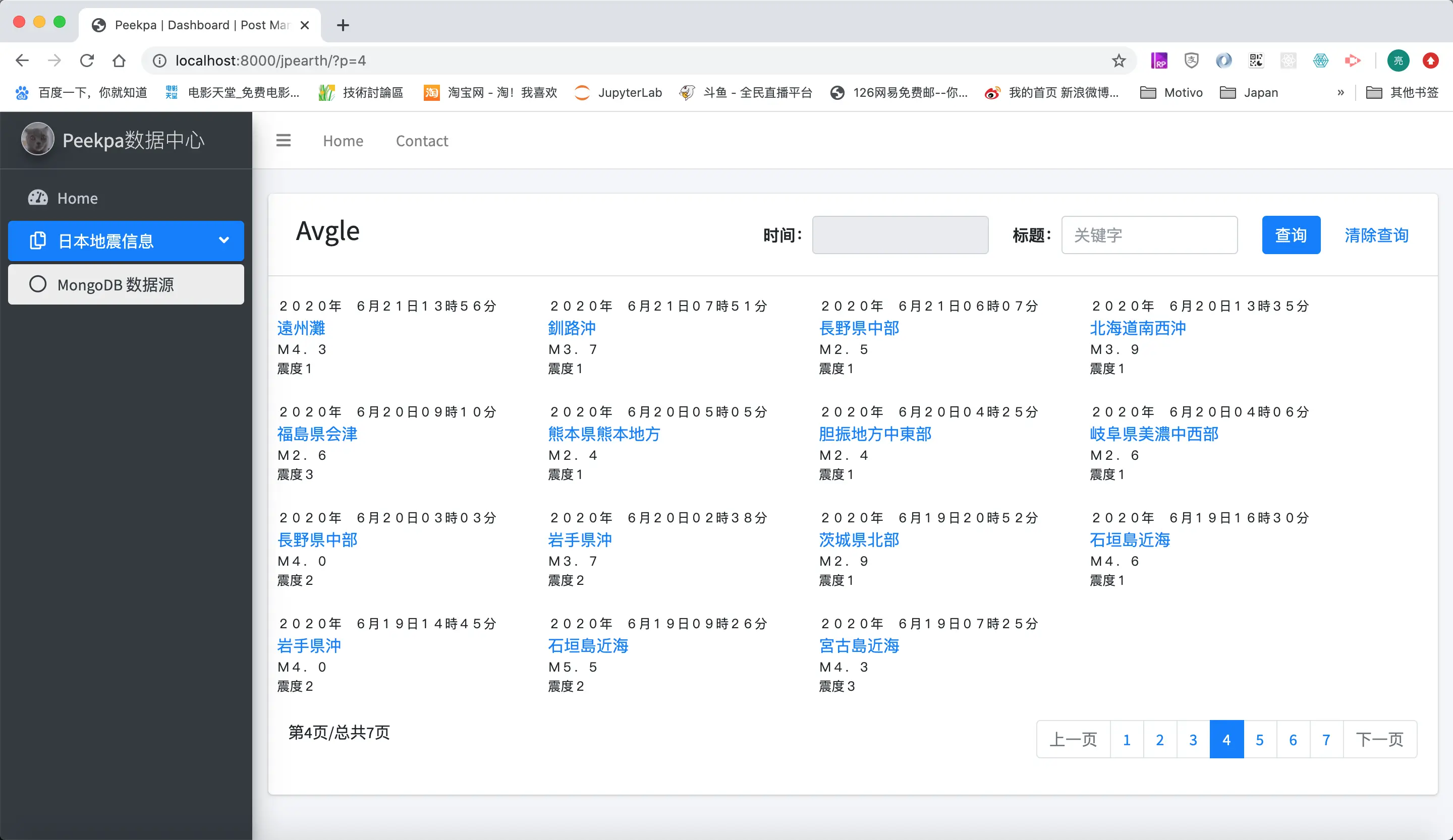我们既然可以在Python中使用PyMongo连接到数据库,那么接下来,我们就要将地震信息在之前写好的DataCenter里面显示了。
