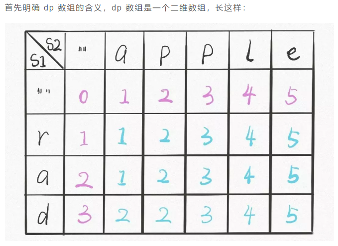 dp状态表格:创建数组dp[s1.length+1][s2.length+1]来记录,避免不断重复计算路径。一般设计的时候都会是这样,行列都是各自长度加一,这样可以把第一行第一列作为基础值先设置一下,最后返回的时候索引是正常的,在循环中的索引一般都是从1开始。