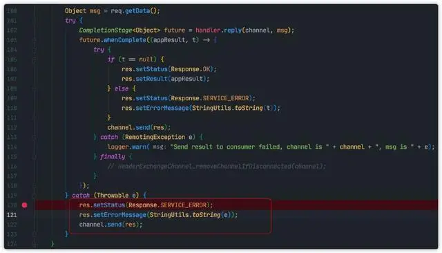 业务方法处理完成之后,然后执行后续逻辑。由于 NoClassDefFoundErrorTestService将会抛出 Error,最终这个 Error,将会在 HeaderExchangeHandler#handleRequest 被捕获,然后将会把相关异常信息返回给调用 Dubbo 消费者。