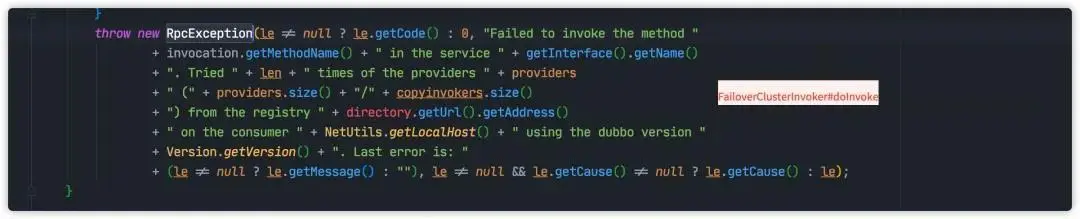 而 RemotingException 最终将会在 FailoverClusterInvoker#doInvoke 转换成RpcException返回给业务代码。