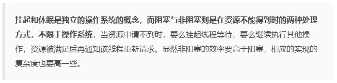 所以,我们常常说的“线程在申请锁失败后会被挂起、然后等待调度”这样有一定歧义,因为这里的“挂起”是操作系统级别的挂起,其实是在申请资源失败时的阻塞,和Java中的线程的挂起(可能已经获得锁,也可能没有锁,总之和锁无关)不是一个概念,很容易混淆,所以在后文中说的挂起,一般指的是操作系统的操作,而不是Thread中的suspend()。