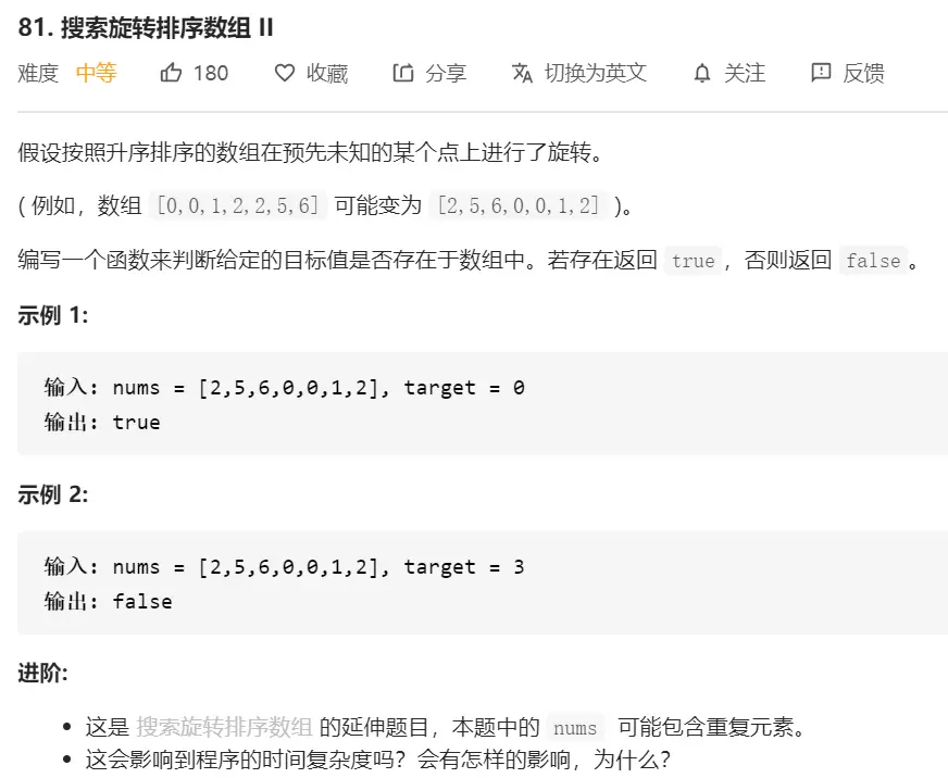 按照二分的套路,我们先判断nums[mid]和target是否相等,如果相等,就不用考虑别的了,直接返回true。 否则,就要在左半部分或右半部分数组寻找target了。