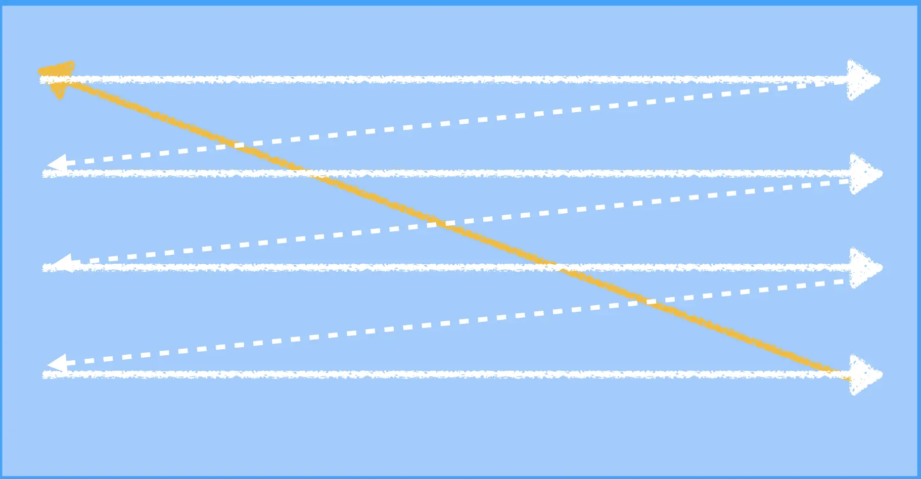 如下图,屏幕是逐行扫描显示内容的,从帧缓冲区不断的读取数据,然后按顺序显示在屏幕上。