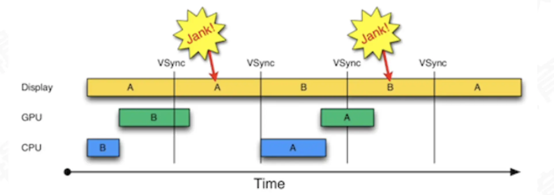 垂直同步+双缓冲区,虽然能解决图像撕裂问题,但会引入新的问题——掉帧。在接收到垂直同步信号的时候,CPU和GPU可能还没有将处理处理完成,这样就视频控制器就拿不到最新的数据,只能显示旧的缓冲数据。造成掉帧(重复渲染同一帧数据)。如下如所示,当VSync来临时,B还没处理好,只能继续显示A。