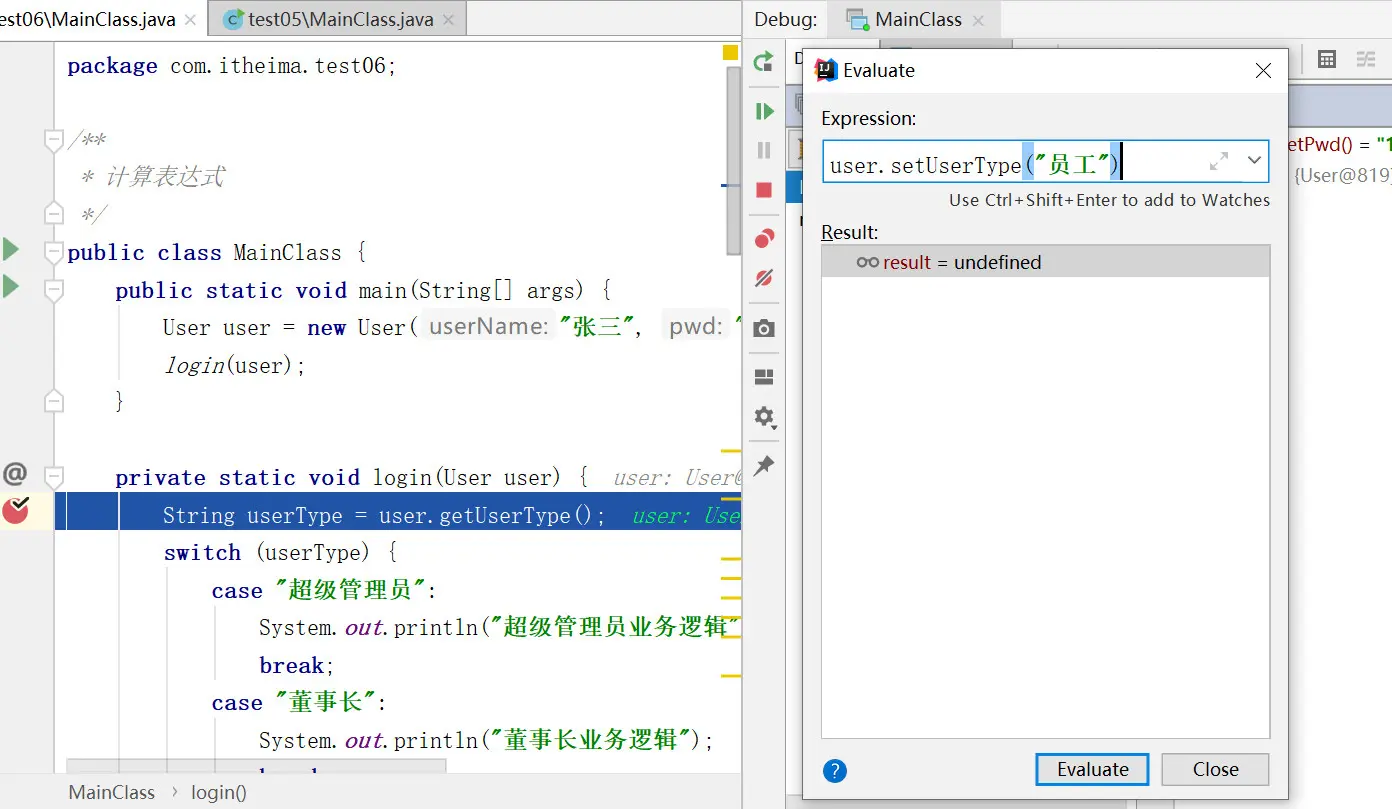 按钮 说明 (Alt + F10):如果你的光标在其它行或其它页面,点击这个按钮可跳转到当前代码执行的行 (F8):步过,一行一行地往下走,如果这一行上有方法不会进入方法。 (F7):步入。如果当前行有方法,可以进入方法内部,一般用于进入自定义方法内,不会进入官方类库的方法。 (Alt + Shift + F7):强制步入,能进入任何方法,查看底层源码的时候可以用这个进入官方类库的方法。 (Shift + F8):步出,==从步入的方法内退出到方法调用处,此时方法已执行完毕== 回退断点。 (Alt + F9):运行到光标处,你可以将光标定位到你需要查看的那一行,然后使用这个功能,代码会运行至光标行,而不需要打断点。 (Alt + F8):计算表达式。(可以查看数据,而且可以修改数据,便于多维度的测试) -