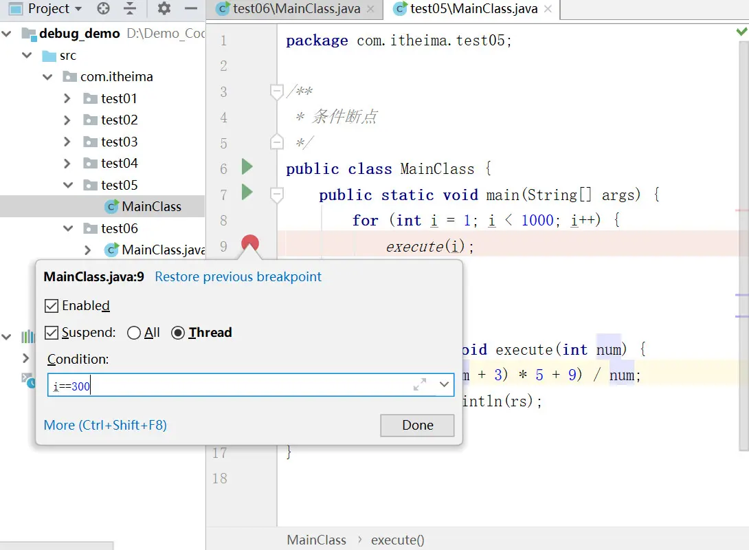 - 通过设置断点条件,在满足条件时,才停在断点处,否则直接运行。