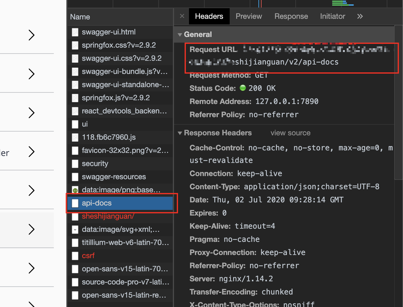 `- 谷歌浏览器打开swagger文档地址, 打开调试模式的Network面板,查看其中api-docs名称的地址,并且复制下来