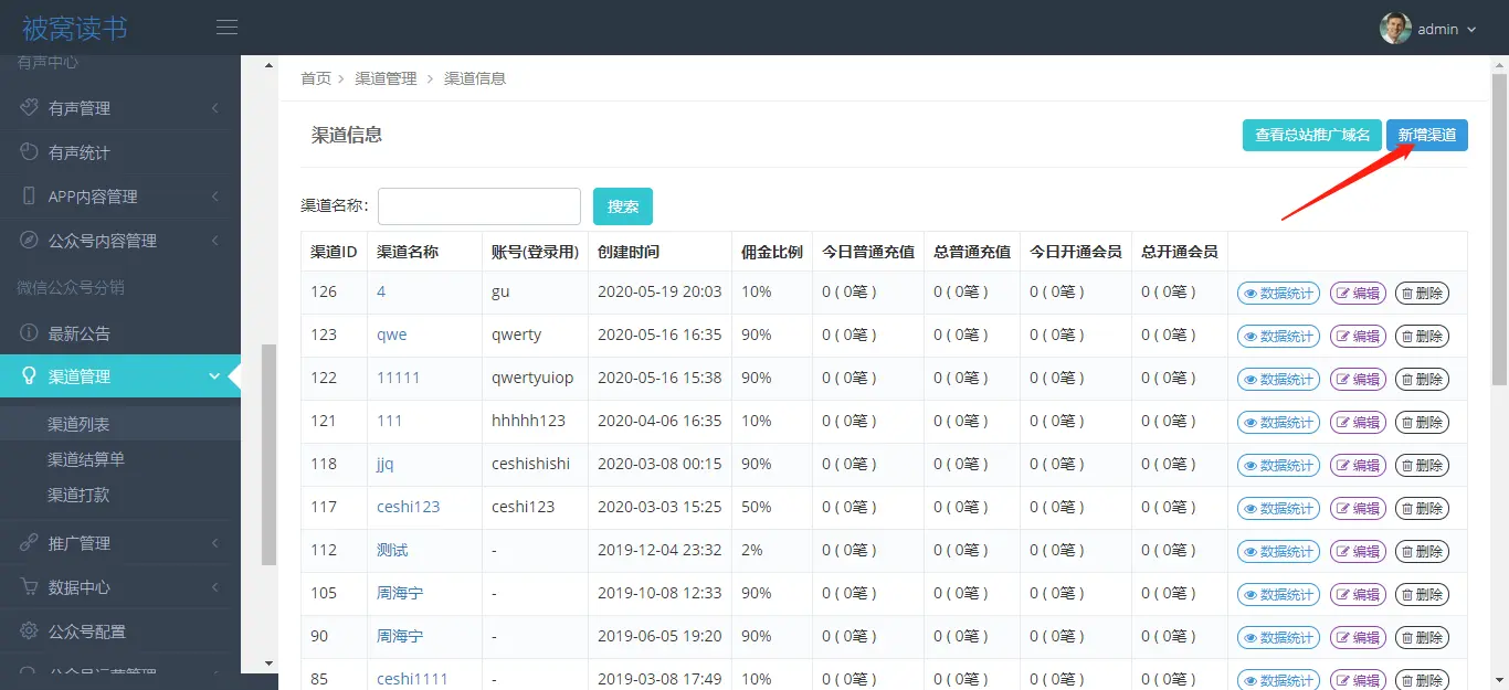 进去箭头指的地方,为代理新增一个渠道,达成一致设置好分成比例,填写打款账户等等,创建成功后,渠道可以通过这个后台一键生成推广链接,进行推广,每月可以进行结款。