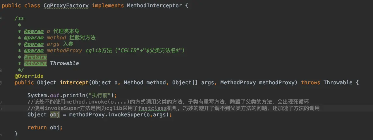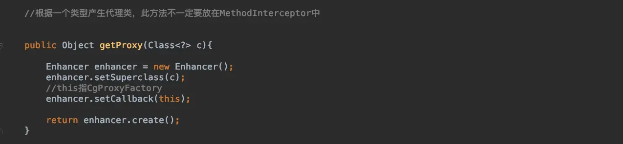 它生成一个继承B对类型C(代理类),这个代理类持有一个MethodInterceptor,我们setCallback时传入对,C重写所有B中的方法,同时在C中,构建名叫“CGLIB”+"$父类方法名$"的方法,所有非私有的且没有被final修饰的方法都会被构建,方法体里只有一句话super.方法名,可以简单的认为保持了对父类方法对一个引用,方便调用。