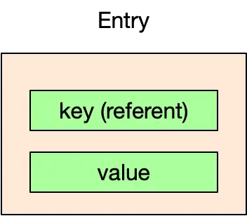 跟进 Entry 的父类,可以看到 ThreadLocal 最终赋值给了 WeakReference 的父类 Reference 的 referent 属性。即,可以认为 Entry 持有了两个对象的引用:ThreadLocal 类型的「弱引用」和 Object 类型的「强引用」,其中 ThreadLocal 为 key,Object 为 value。如图所示: