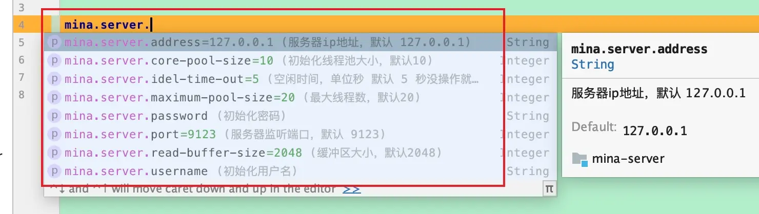 application.properties里名称是mina.server前缀加上属性的名称,如果是驼峰命名的,则用-分隔开,如mina.server.read-buffer-size。- 属性的默认值就是,我们声明时创建的值。