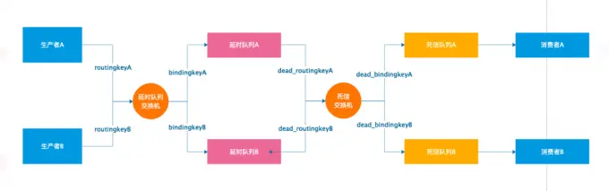生产者生产一条延时消息,根据需要延时时间的不同,利用不同的routingkey将消息路由到不同的延时队列,每个队列都设置了不同的TTL属性,并绑定在同一个死信交换机中,消息过期后,根据routingkey的不同,又会被路由到不同的死信队列中,消费者只需要监听对应的死信队列进行处理即可。