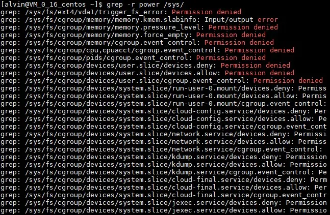 $ grep -r power /sys/由于 /sys 文件夹下存在很多非 root 用户无法访问的文件,这样就会造成很多 Permission denied 错误,并被输出到屏幕上。