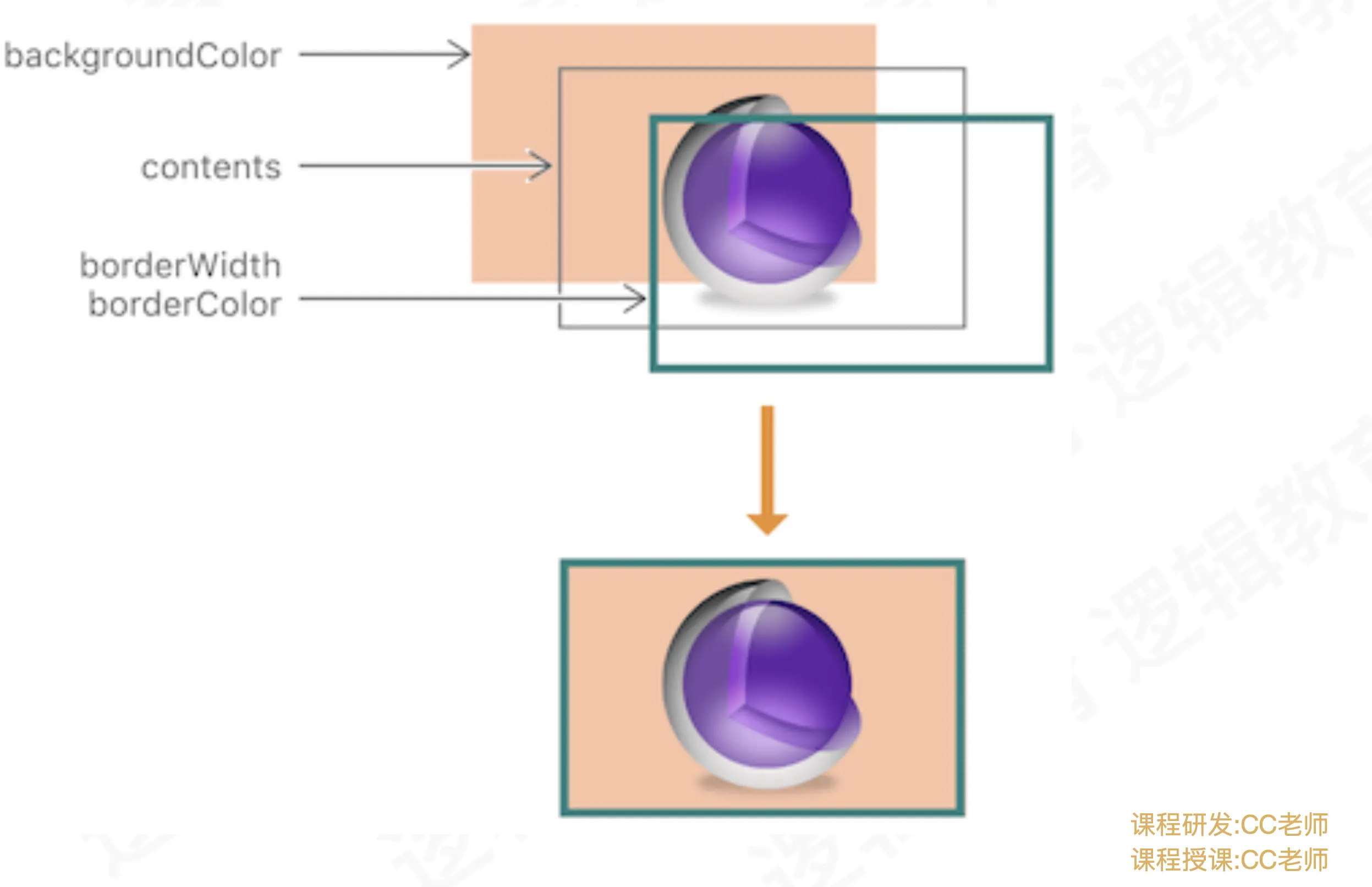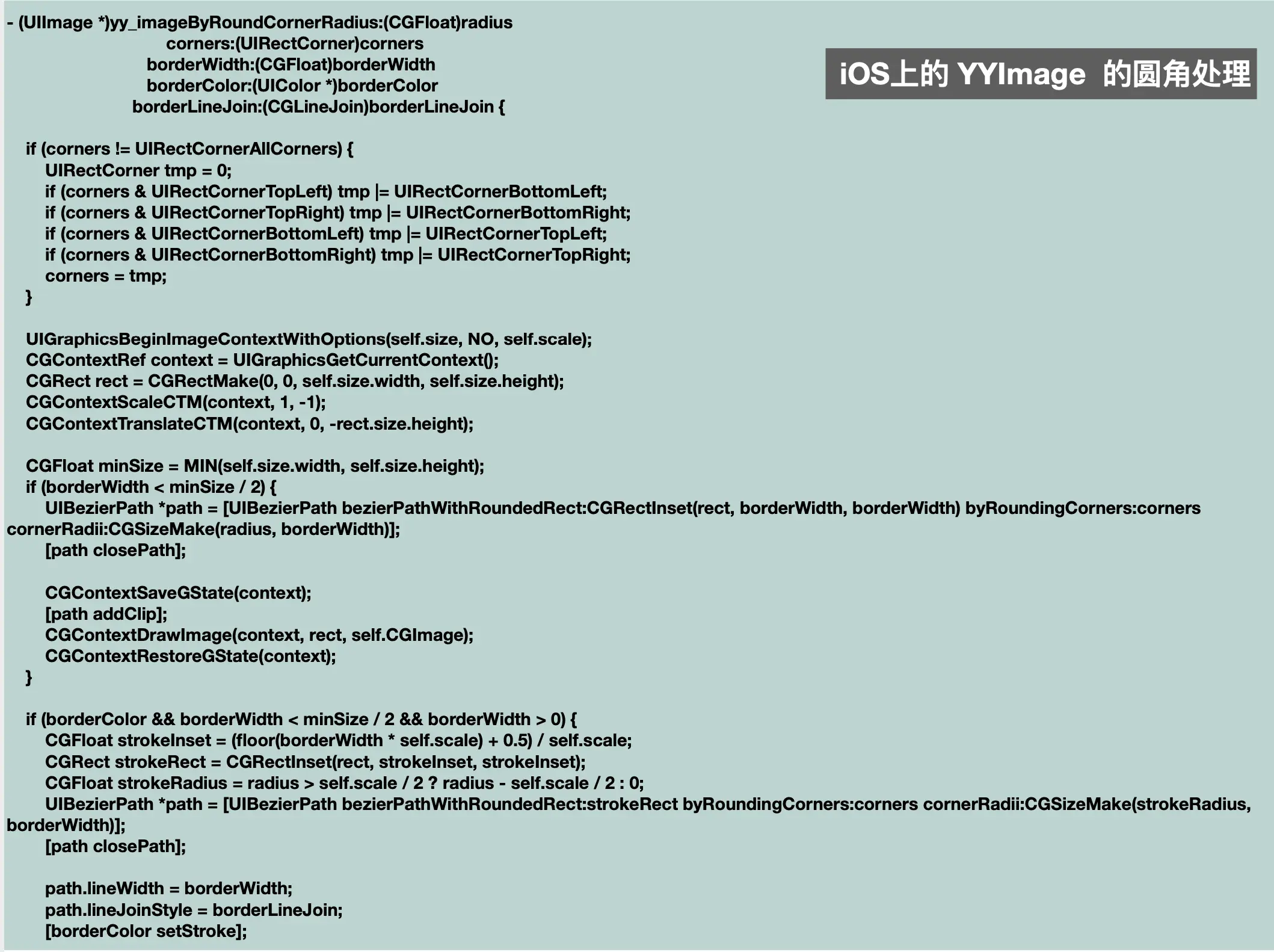 如上图:它的显示效果类似UImageView设置了背景颜色,image和边框,分别对应backgroundColor、contents和border三个图层;现在我们要对其进行圆角处理,就需要分别将这三个图层加载到离屏渲染缓冲区,然后进行统一的圆角处理后生成新的图层,并加载到帧缓冲区,等到下一个runloop由于视图控制器显示到屏幕上。