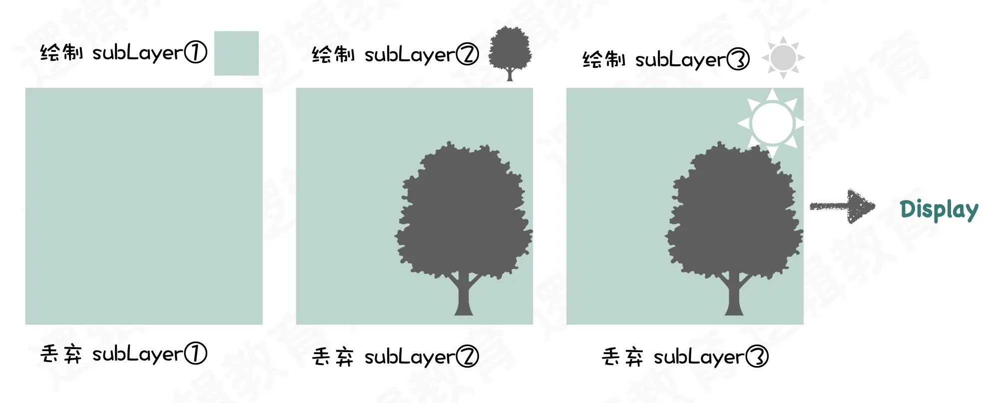类似的,当出现三个图层混合成才能显示效果的时候,也需要进行如上的操作!于是就有了离屏渲染机制的出现。
