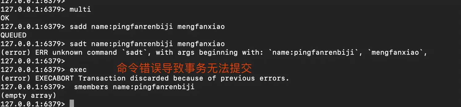 - 命令错误,语法不正确,导致事务不能正常结束