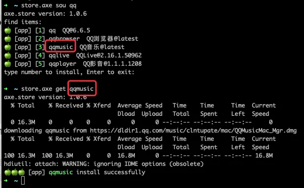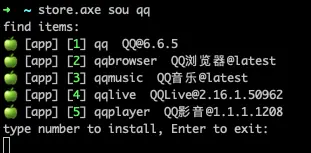 - 下图演示了直接安装 QQ 音乐: store.axe get qqmusic (推荐使用 store.axe sou 来安装)