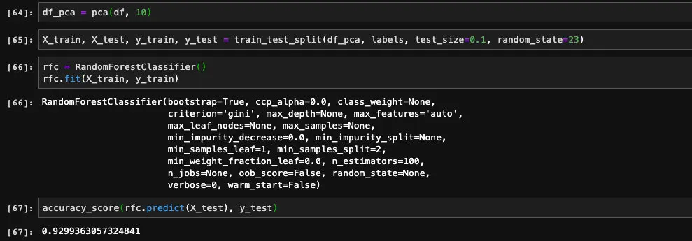 我们可以看到,在PCA之前,随机森林在测试集上的表现是92.3%的准确率。