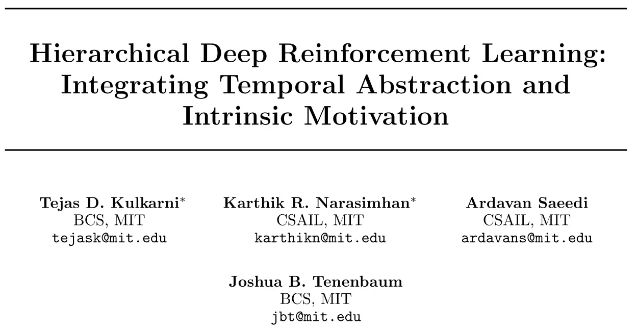 Kulkarni T D, Narasimhan K, Saeedi A, et al. Hierarchical deep reinforcement learning: Integrating temporal abstraction and intrinsic motivation[C]//Advances in neural information processing systems. 2016: 3675-3683.
