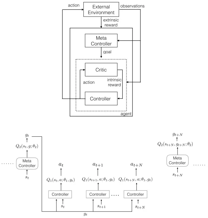 ,给出动作。其中Critic会根据目标g是否完成,给controller一个合适的intrinsic reward。当episode ends或者目标g完成时,controller会终止。