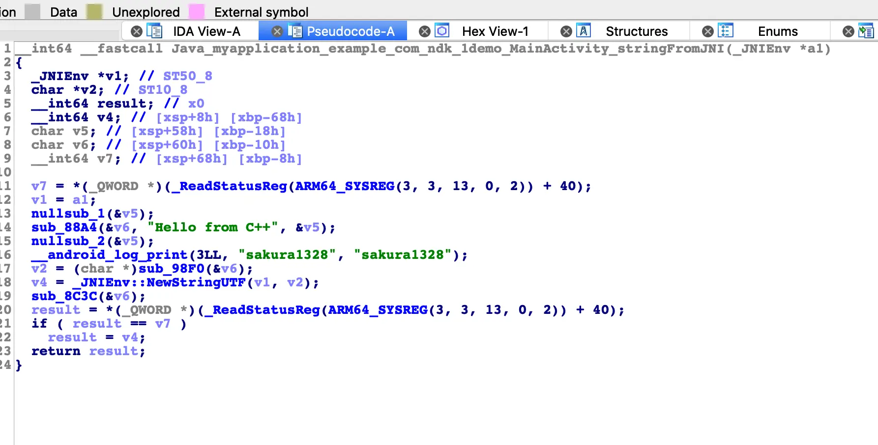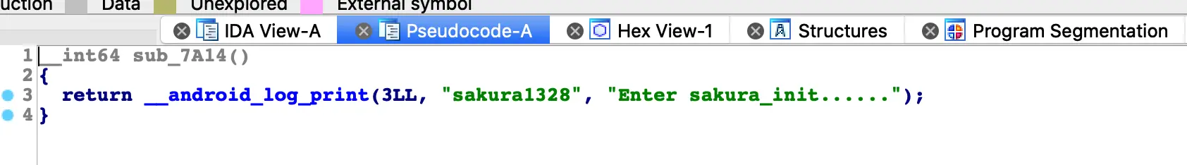 var sakura_add_addr1 = Module.findExportByName("libnative-lib.so", "_Z10sakura_addii");