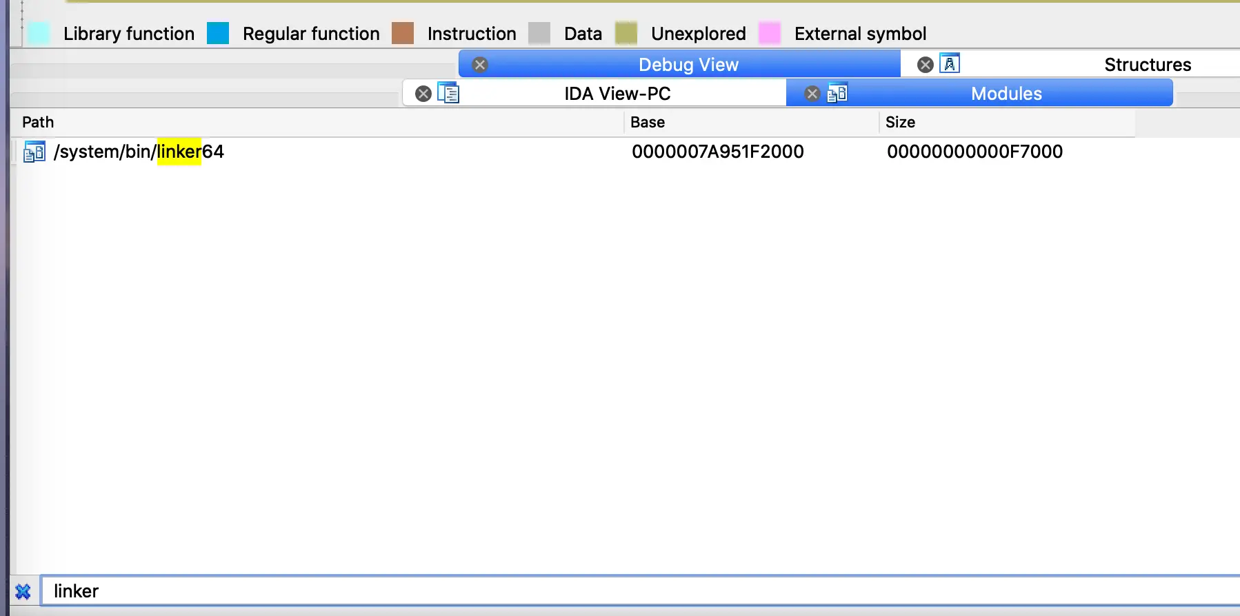 var symbols = Module.enumerateSymbolsSync(linkername);