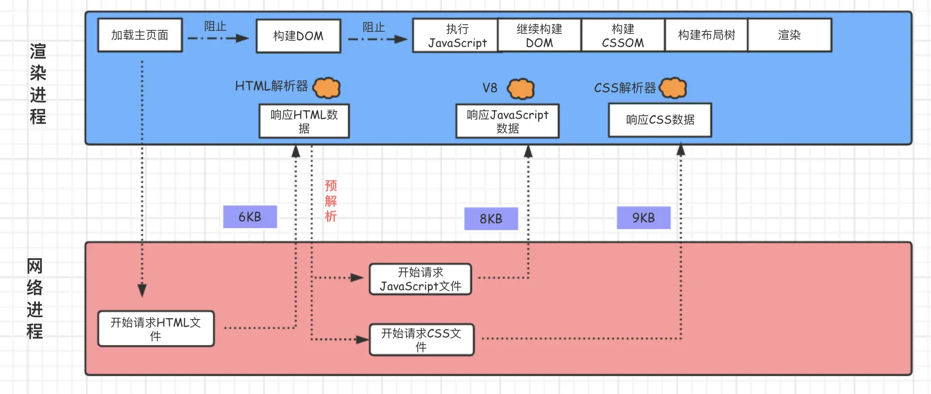 我们先来分析如何系统优化加载阶段中的页面,来看一个典型的渲染流水线,如下图所示: