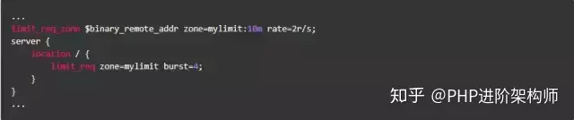 按请求速率限速是指限制单个IP(或者其他的key)发送请求的速率,超出指定速率后,Nginx将直接拒绝更多的请求。采用leaky bucket算法实现。为深入了解这个模块,我们先从实验现象说起。开始之前我们先简单介绍一下该模块的配置方式,以下面的配置为例: