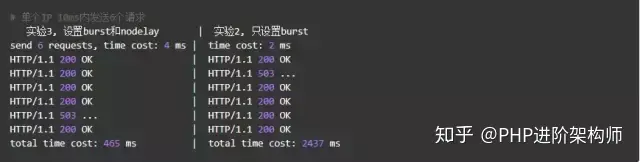 相比实验1成功数增加了4个,这个我们设置的burst数目是一致的。具体处理流程是:1个请求被立即处理,4个请求被放到burst队列里,另外一个请求被拒绝。通过burst参数,我们使得Nginx限流具备了缓存处理突发流量的能力。