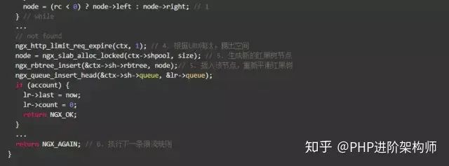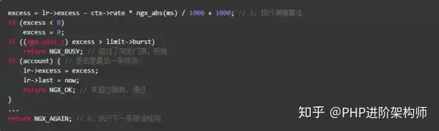 上述代码受限算出当前key上遗留的请求数,如果超过了burst,就直接拒绝;由于Nginx允许多条限速规则同时起作用,如果已是最后一条规则,则允许通过,否则执行下一条规则。