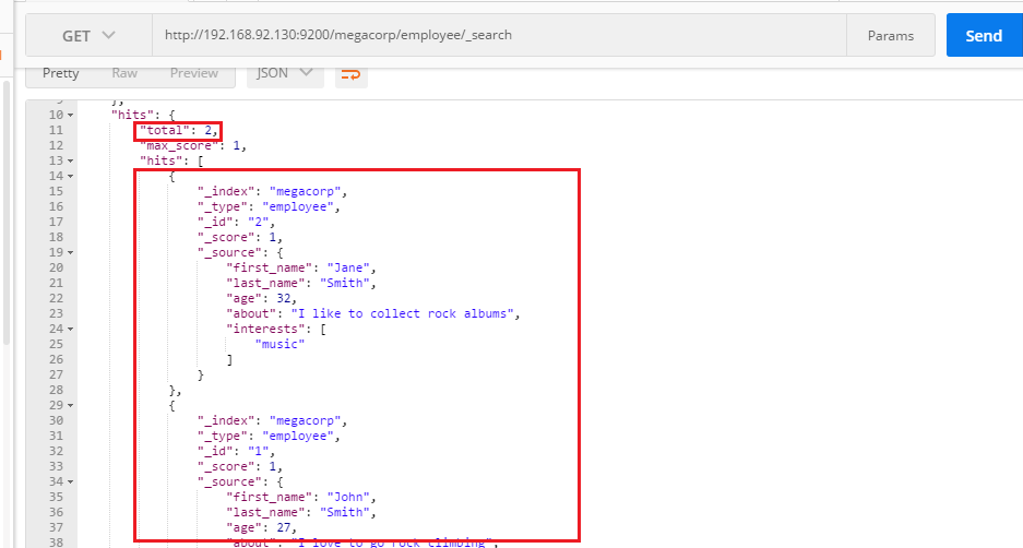 返回结果包括了所有二个文档,放在数组 hits 中。一个搜索默认返回十条结果。