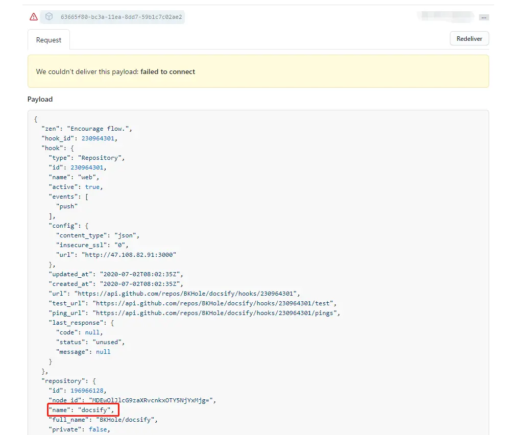 验证webhook配置成功,点击红色感叹号右侧内容,出现如下请求信息