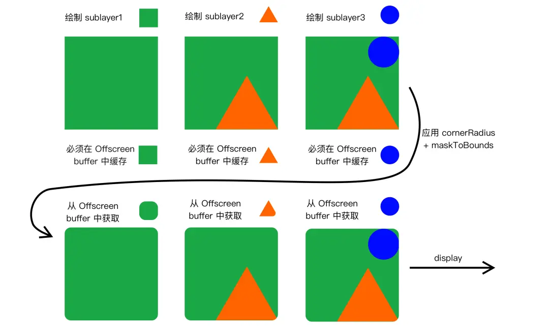 - 和非离屏渲染模式相比多了进行额外的渲染合并,是对多个texture进行合并的过程。多了这么一步,所以说对性能要求更高一些。更容易出现掉帧的情况。