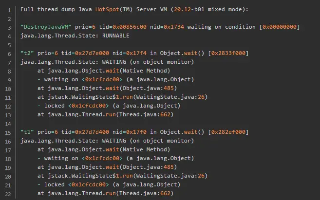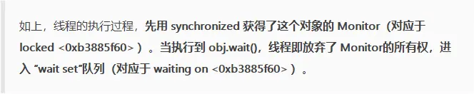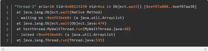也就是说对象先上锁,锁住对象0xb3885f60,然后释放该对象锁,进入waiting状态。为啥会出现这样的情况呢?看看下面的java代码示例,就会明白:
