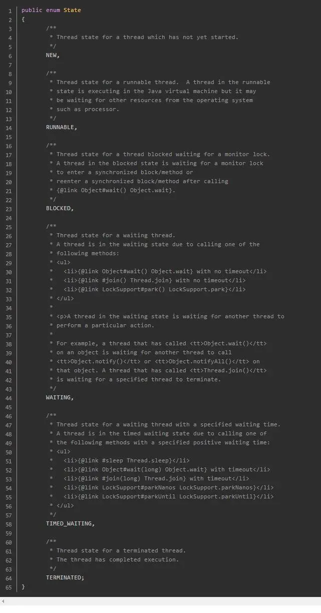 线程的状态是一个很重要的东西,因此thread dump中会显示这些状态,通过对这些状态的分析,能够得出线程的运行状况,进而发现可能存在的问题。线程的状态在Thread.State这个枚举类型中定义: