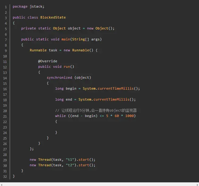 先获取object的线程会执行5分钟,这5分钟内会一直持有object的监视器,另一个线程无法执行处在BLOCKED状态: