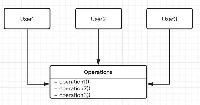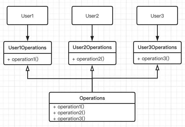 现在我们看下一个违反接口隔离原则的例子,从上面类结构图中,有多个用户需要操作 Operation 类。如果 User1 只需要使用 operation1 方法,User2 只需要使用 operation2 方法,User3 只需要使用 operation3 方法,那么很明显对于 User1 来说,不应该看到 operation2 和 operation3 这两个方法,要减少对自己不关心的方法的依赖,防止 Operation 类中 operation2 和 operation3 方法的修改,影响到 User1 的功能。这个问题可以通过将不同的操作隔离成独立的接口来解决,具体如下图所示。