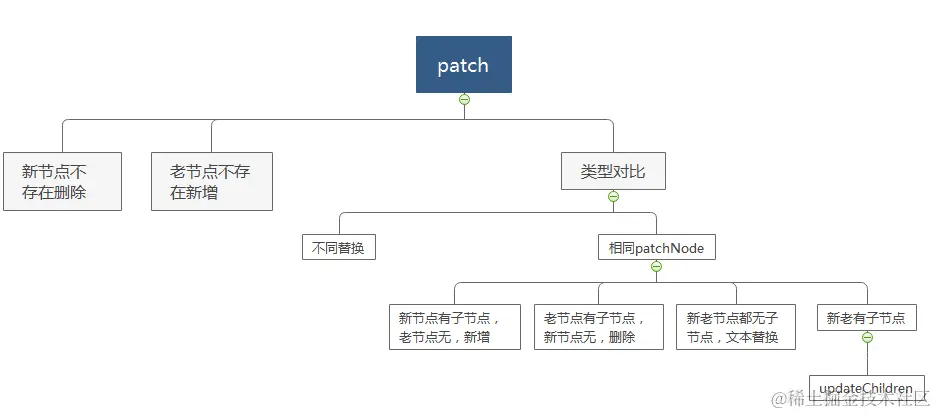 执行patch函数,首先判断新老节点是否存在,都存在则进行类型比较。diff运算的核心为updatechildren。 updatechildren会将新旧vnode的首尾节点进行两两交叉对比,类型相同则执行patchNode,如果是首尾对比,需要移动真实DOM节点的位置。接下来指针向中间移动,重复对比。