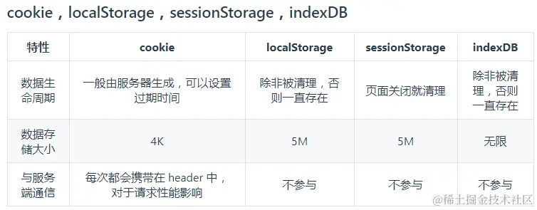 可以从存储大小、时间以及是否与服务器通信分析:cookie可以和服务端通信,跨域情况下:
