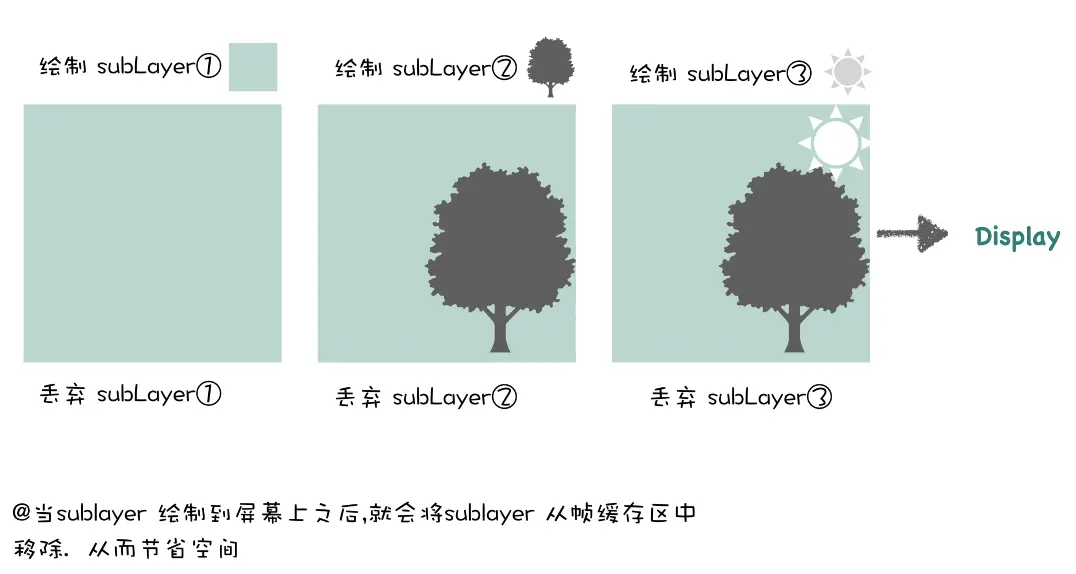 当对layer设置透明度时, 还是会先等待所有的图层处理到离屏缓冲区后,计算整体的透明颜色,得到新的颜色后进行渲染