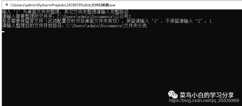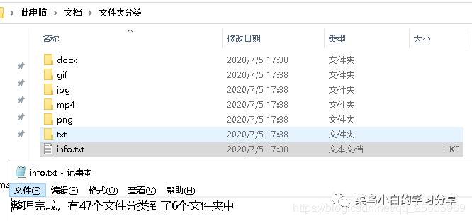 有需要程序执行文件的小伙伴关注公众号“菜鸟小白的学习分享”回复“文件分类器可执行文件”即可获取菜鸟小白打包好的可执行程序下载链接。